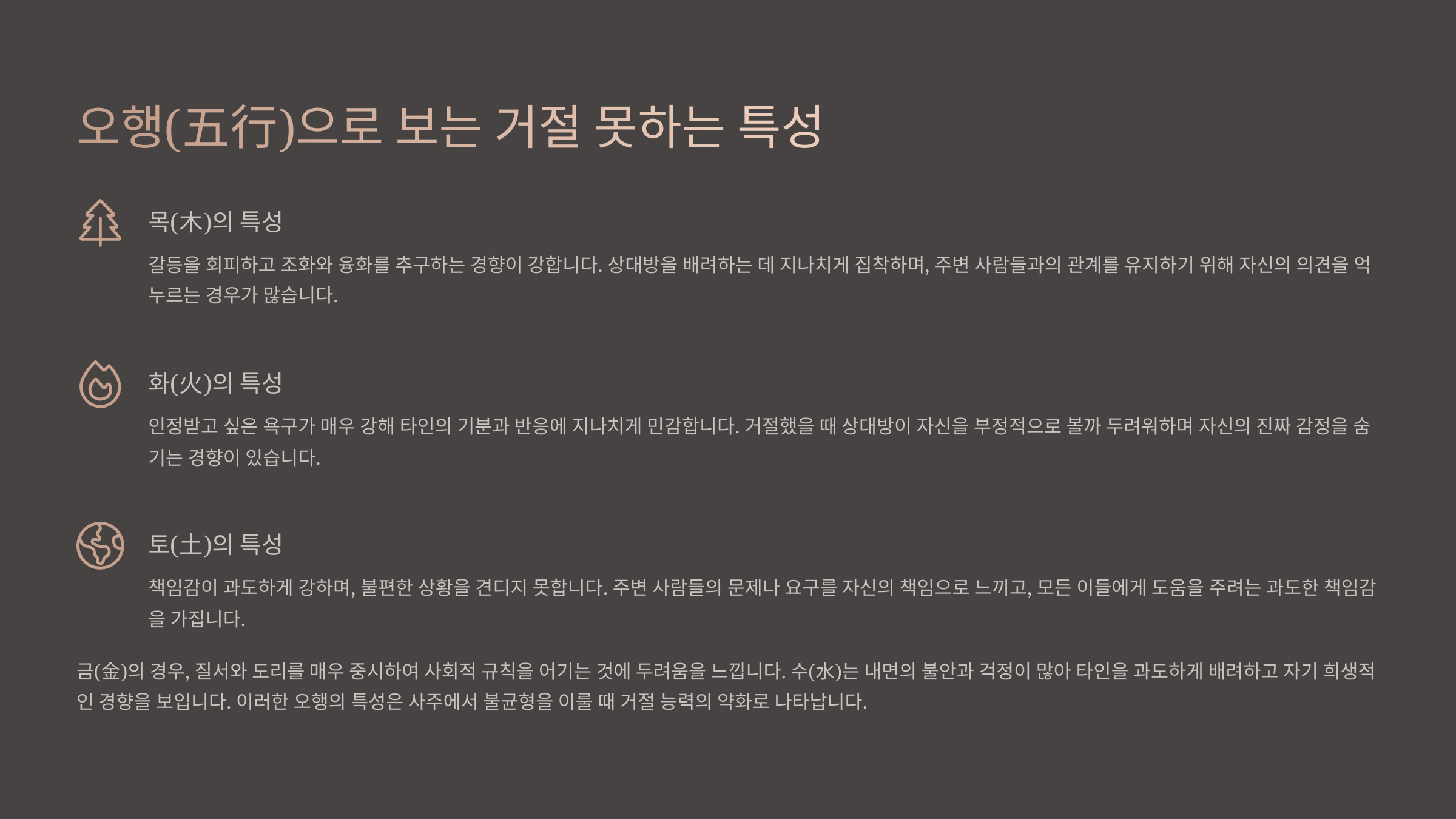 | 토(土) | 중재자 역할 | 갈등이 생길까 봐 | 자기 희생 |