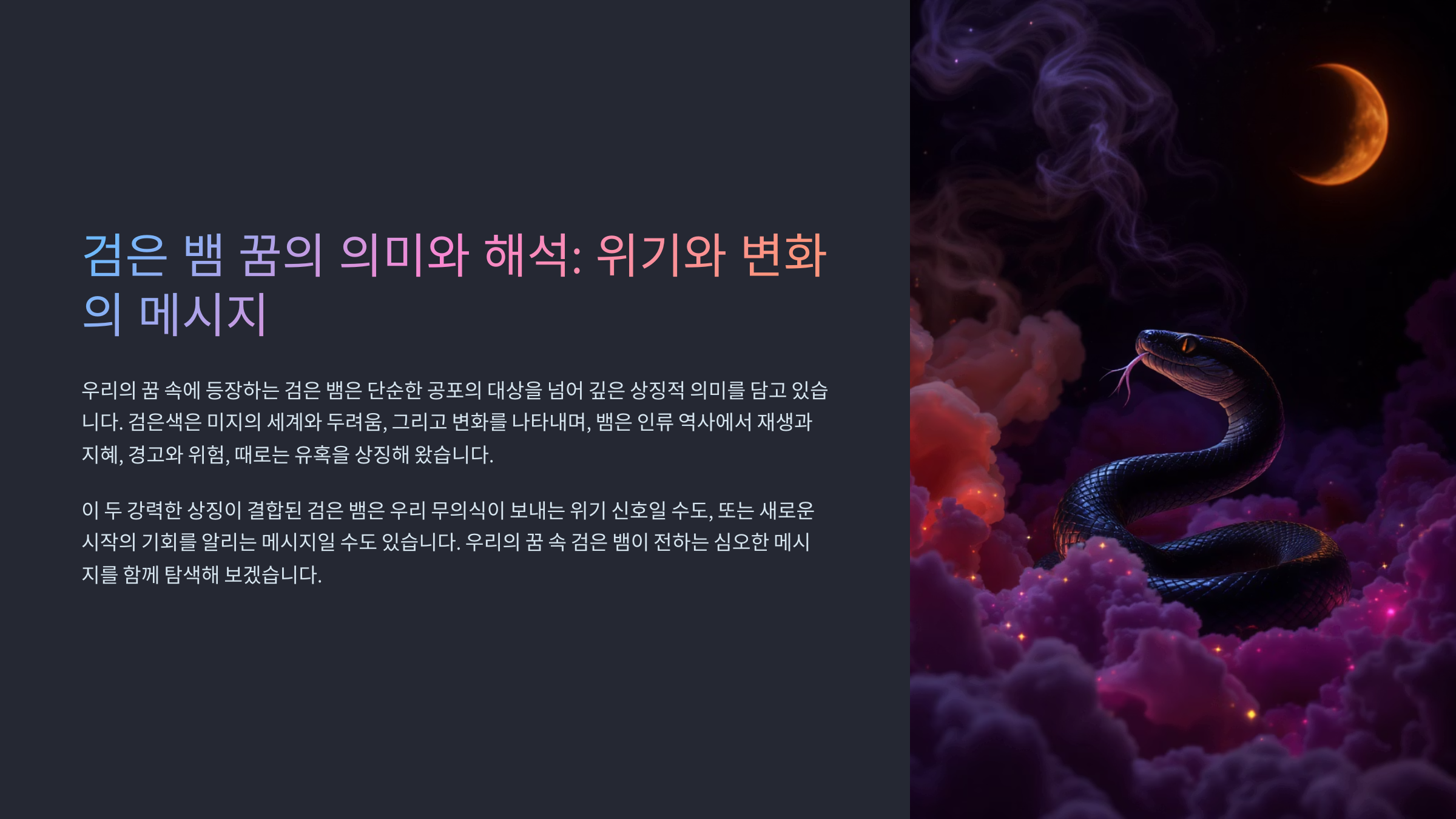 검은 뱀이 나오는 꿈은 단순한 악몽이 아니에요. 수천 년 동안 인류는 뱀 꿈을 특별한 메시지로 받아들여 왔죠. 특히 검은색 뱀은 무의식의 깊은 곳에서 올라오는 중요한 신호일 가능성이 높아요. 이 꿈을 제대로 해석하면 인생의 전환점을 맞이할 수도 있답니다.