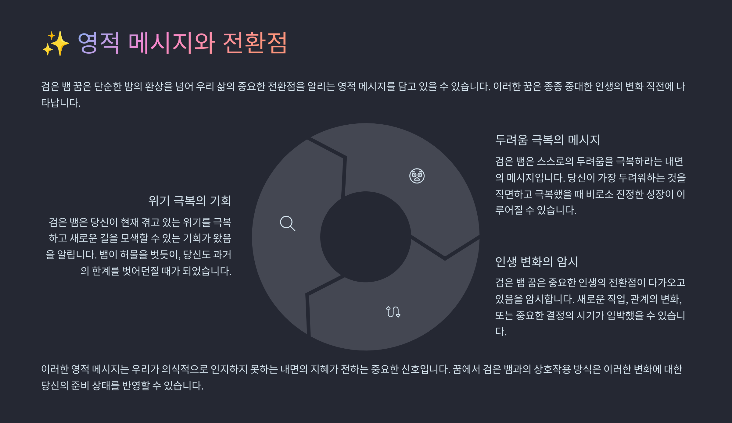 | 검은색 | 무의식, 미지의 영역 | 잠재력 발견 | 두려움 직면 필요 |