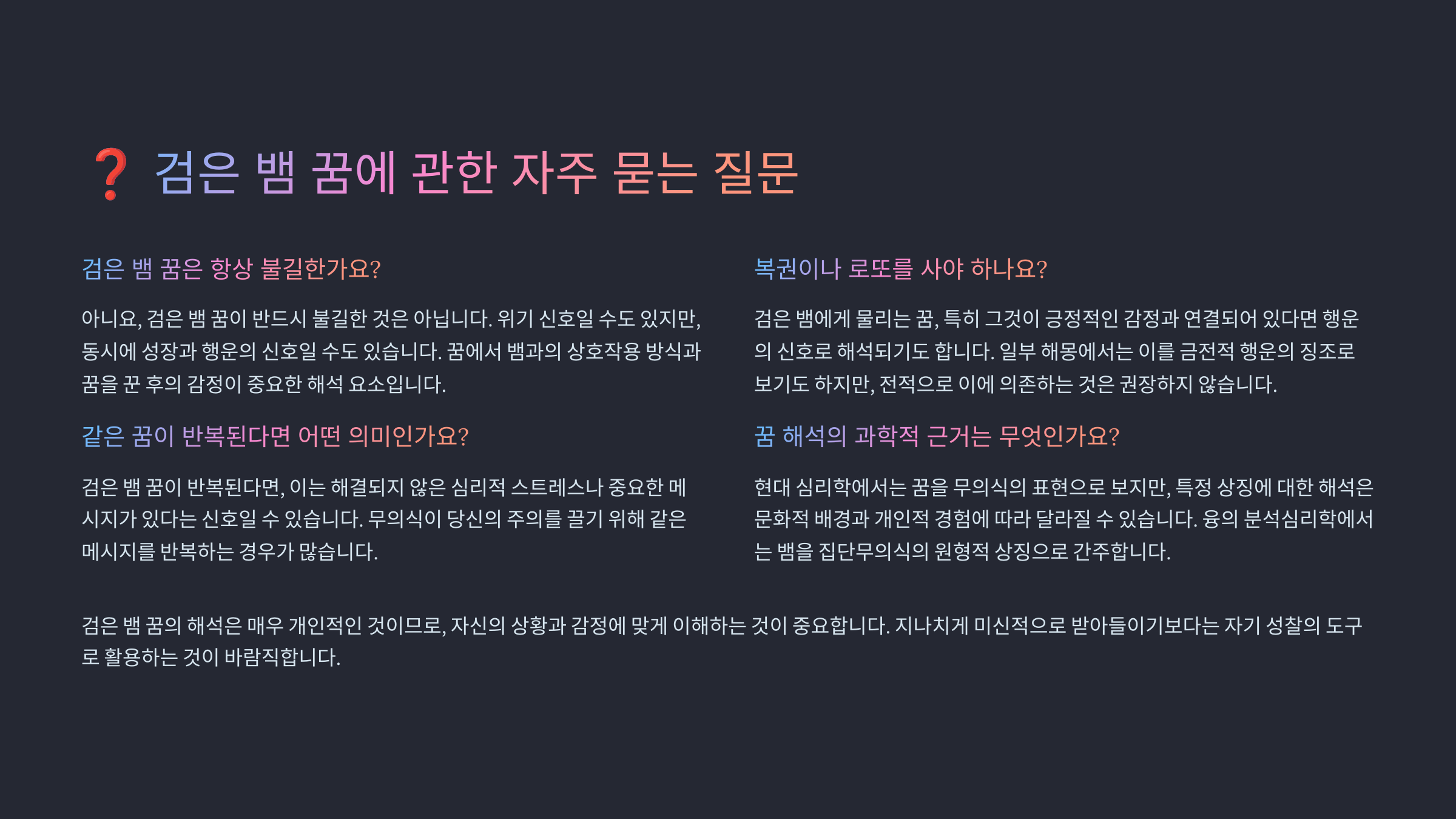A1. 네, 특정 시기에 반복되는 꿈은 정상이에요. 반복되는 검은 뱀 꿈은 무의식이 중요한 메시지를 전달하려고 계속 시도한다는 뜻이에요. 이는 당신이 아직 그 메시지를 충분히 이해하거나 행동으로 옮기지 않았다는 신호일 수 있어요. 꿈 일기를 꾸준히 작성하면서 패턴을 찾아보고, 현재 삶에서 변화가 필요한 부분이 무엇인지 성찰해보세요.