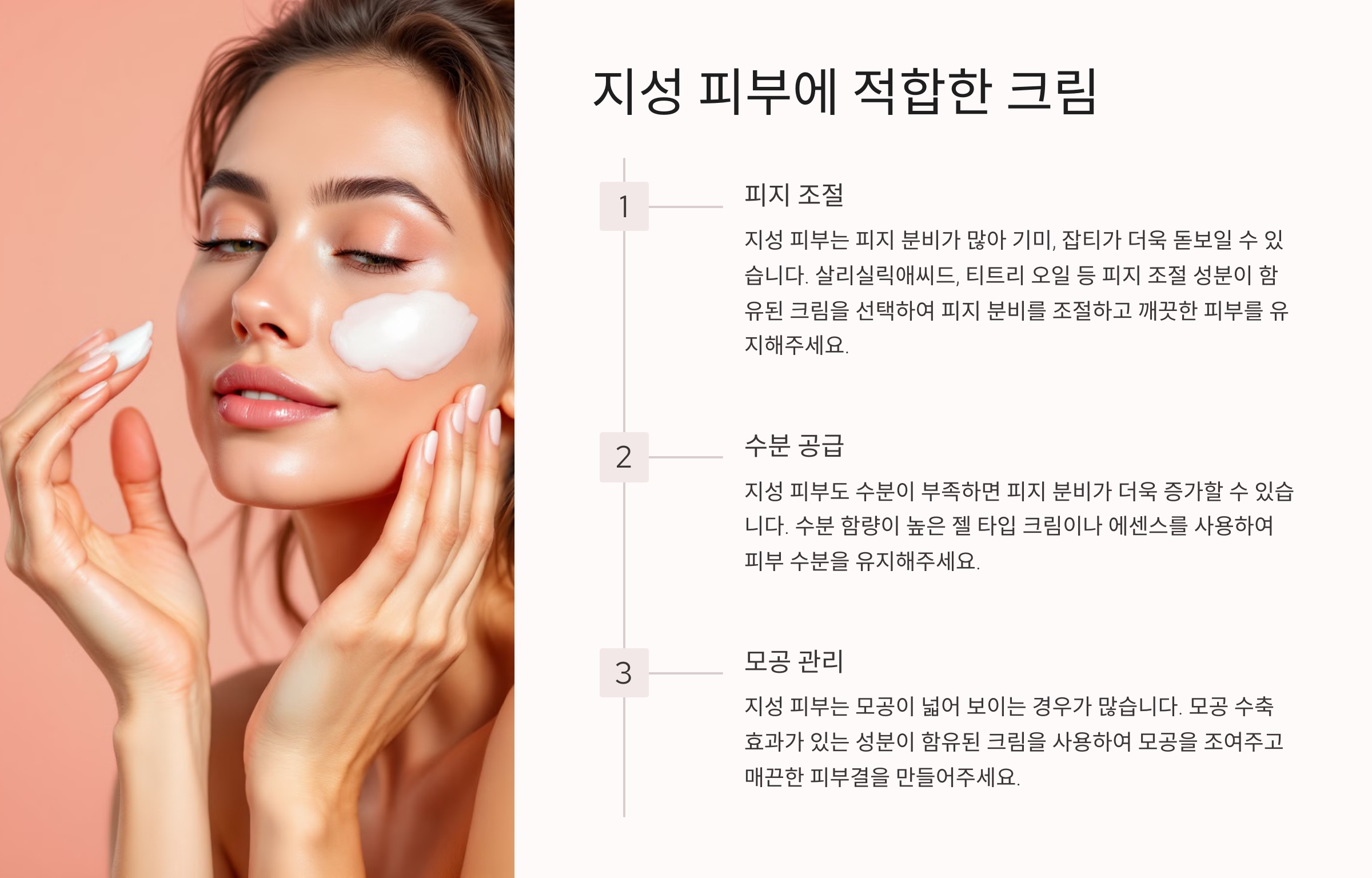 지성 피부는 피지 분비가 과다하여 번들거림이 생기기 쉽기 때문에 가벼운 텍스처의 크림을 선택하는 것이 중요해요. 유분이 적고 산뜻하게 흡수되는 젤 타입 크림이 추천돼요.