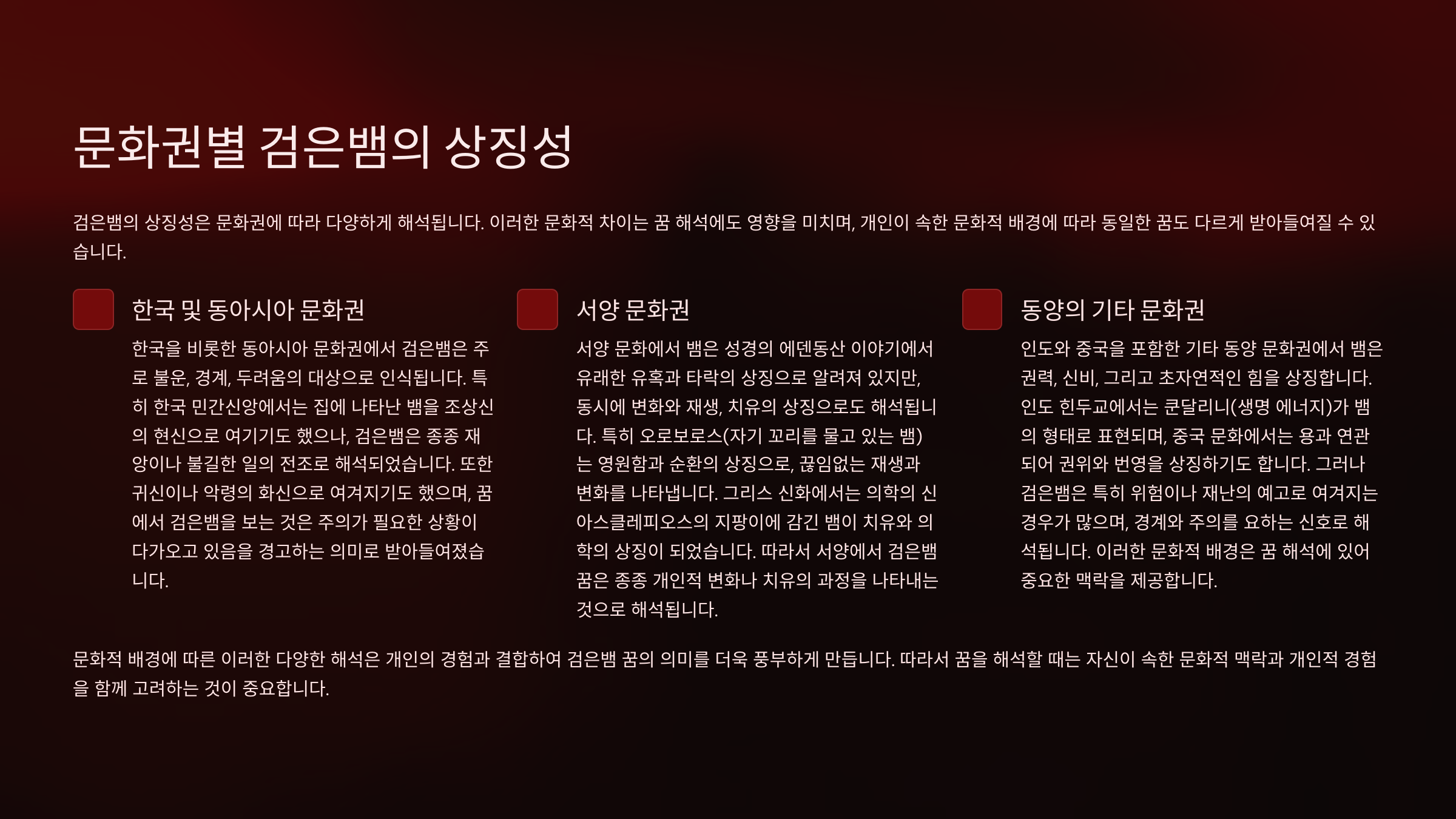 | 문화권 | 주요 상징 | 꿈 해석 |