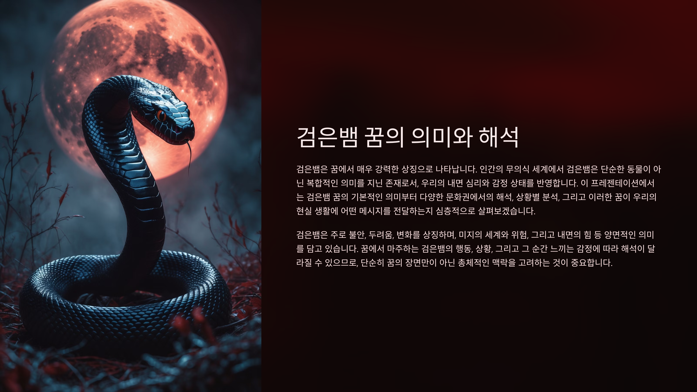 검은뱀이 나오는 꿈은 많은 사람들이 경험하는 강렬한 꿈 중 하나예요. 이런 꿈을 꾸고 나면 불안하거나 궁금한 마음이 들기 마련인데요, 실제로 검은뱀의 꿈은 우리 무의식이 보내는 중요한 신호일 수 있어요. 꿈속의 검은뱀은 단순한 이미지가 아니라 현재 당신의 심리 상태와 삶의 상황을 반영하는 거울과 같답니다.