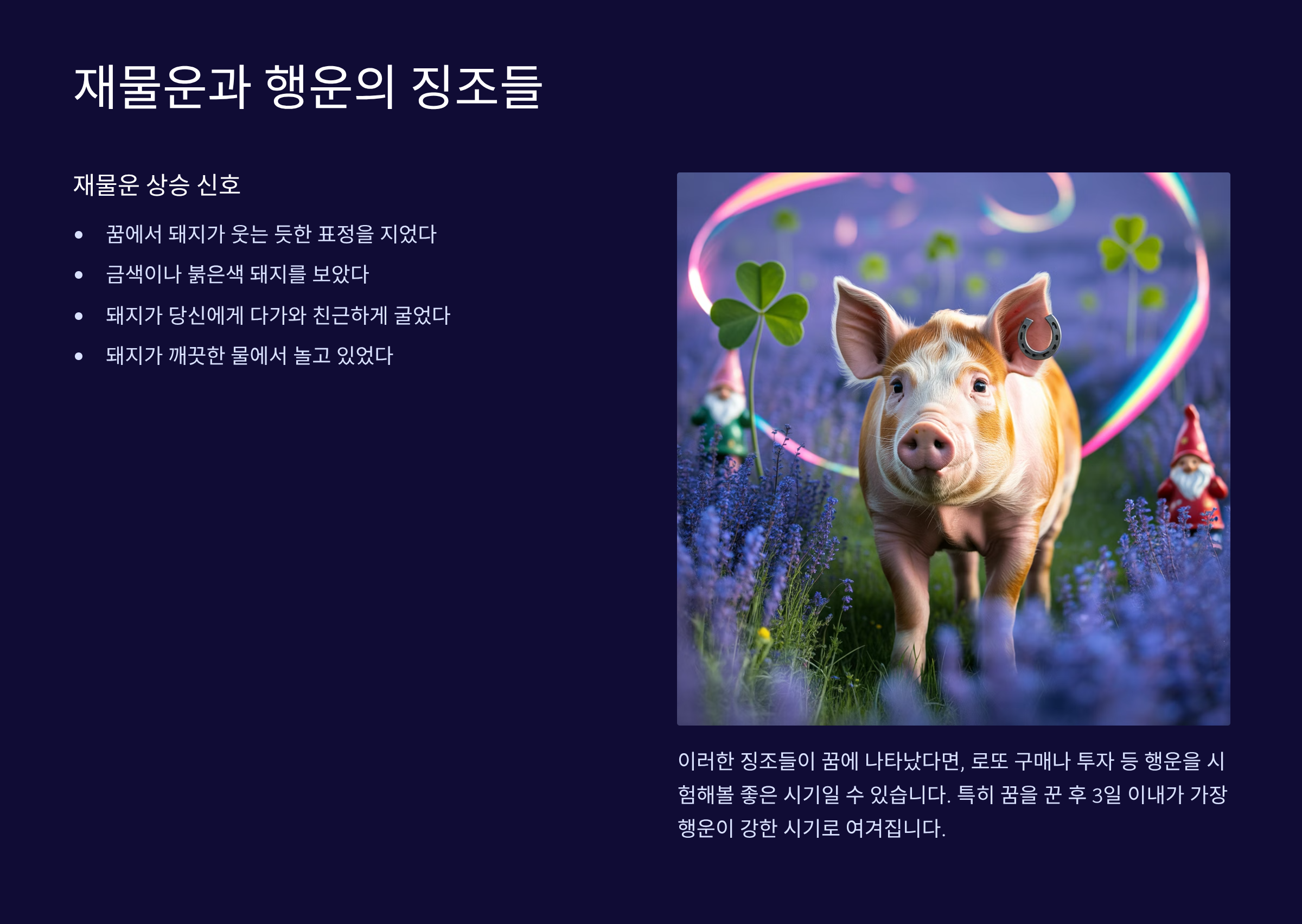 나의 생각으로는 돼지 꿈의 상황은 현실의 재물 흐름을 상징적으로 보여주는 것 같아요. 꿈에서 돼지와 긍정적인 상호작용을 했다면 현실에서도 돈과 좋은 관계를 맺을 수 있을 거예요. 중요한 건 꿈의 메시지를 받아들이고 적극적으로 행동하는 거예요! 📍