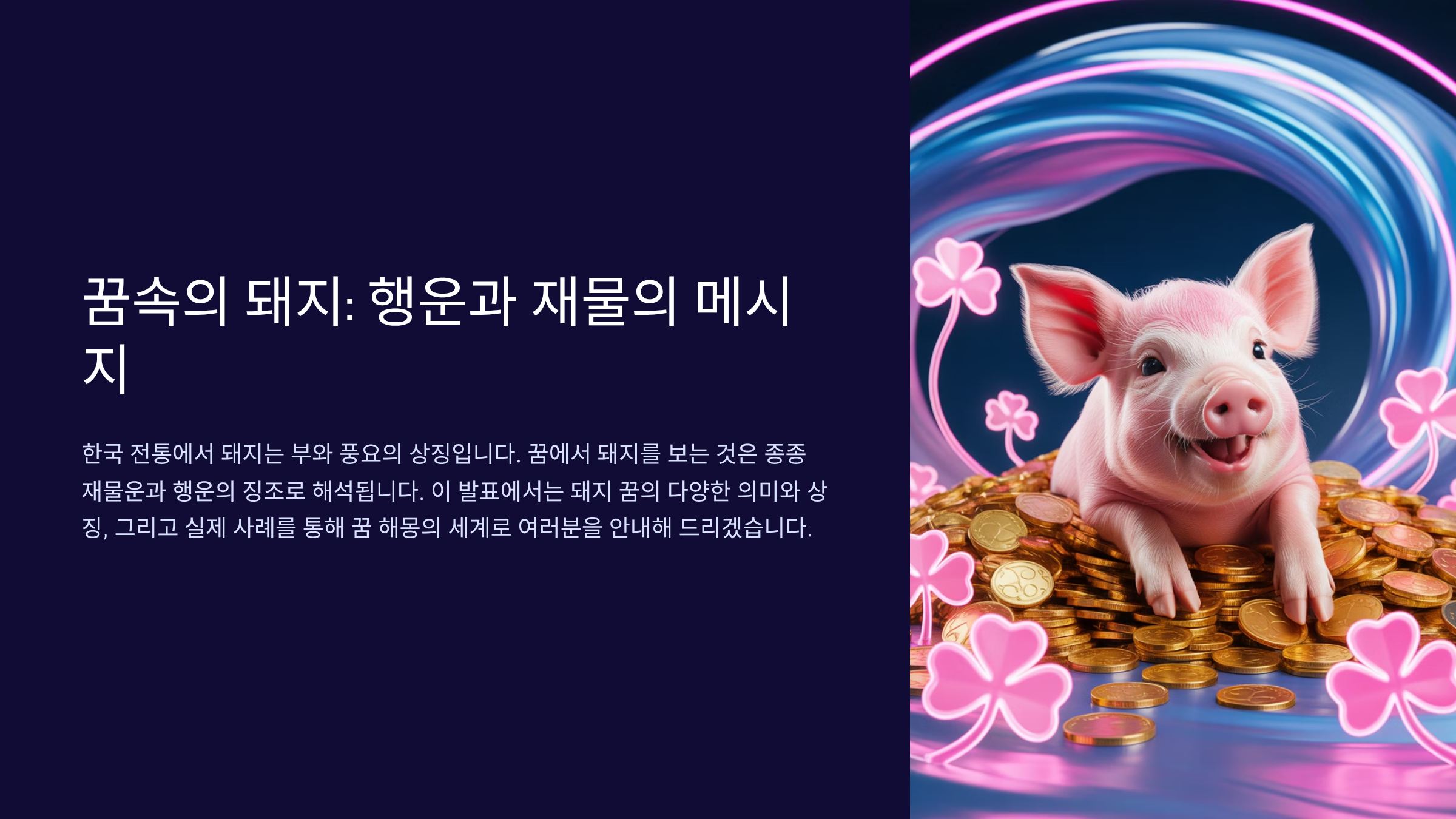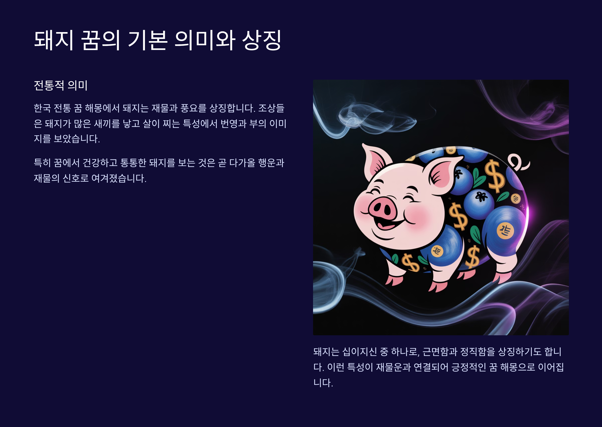 돼지는 동서양을 막론하고 풍요와 재물의 상징으로 여겨져 왔어요. 특히 한국에서는 돼지꿈을 꾸면 재물운이 들어온다고 믿는 전통이 있죠. 과연 이런 믿음에는 어떤 근거가 있을까요? 함께 알아보면서 여러분의 꿈이 어떤 메시지를 담고 있는지 확인해보세요!