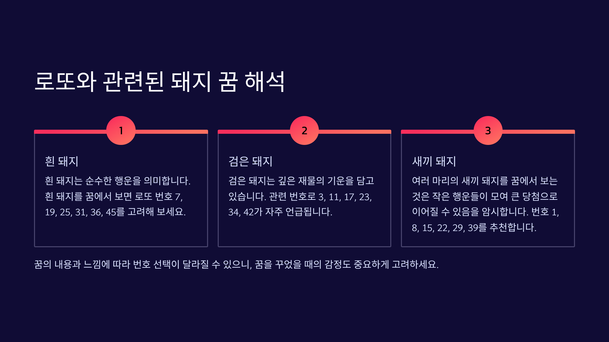 나의 생각으로는 돼지 꿈의 진짜 가치는 로또 당첨 여부가 아니라 긍정적인 기대감을 주는 것에 있어요. 좋은 꿈을 꾸면 하루가 즐겁고, 그런 긍정적인 에너지가 실제로 좋은 일을 끌어당기는 것 같아요. 로또를 사든 사지 않든, 돼지 꿈은 그 자체로 행복한 선물이에요! 📊