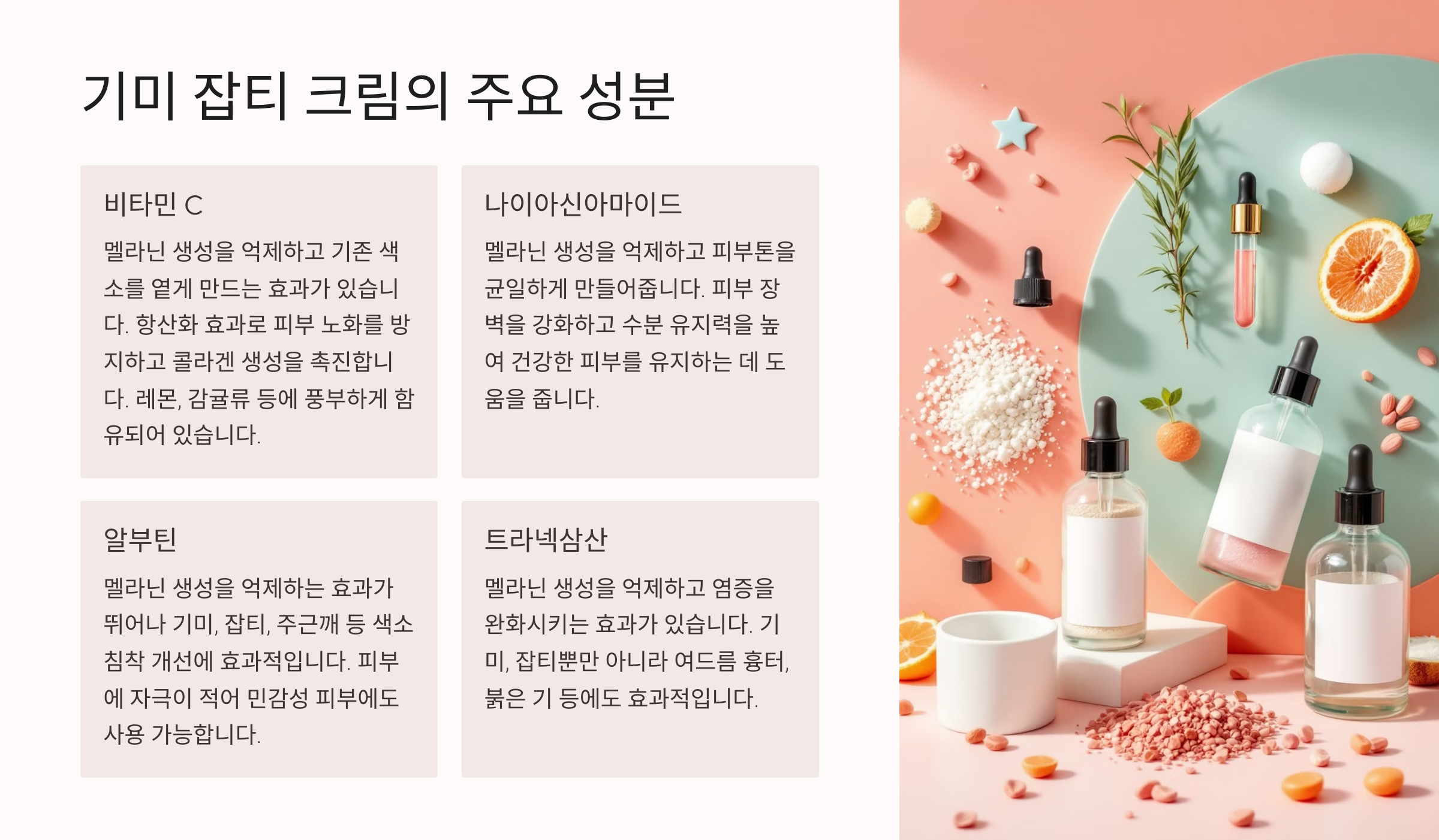 나이아신아마이드는 피부 장벽을 강화하고 피부 톤을 균일하게 만들어줘요. 비타민 C는 항산화 효과가 뛰어나 멜라닌 축적을 막고 피부 재생을 도와줘요. 알부틴과 코직산은 멜라닌 억제제로서 기미 개선에 효과적이에요.