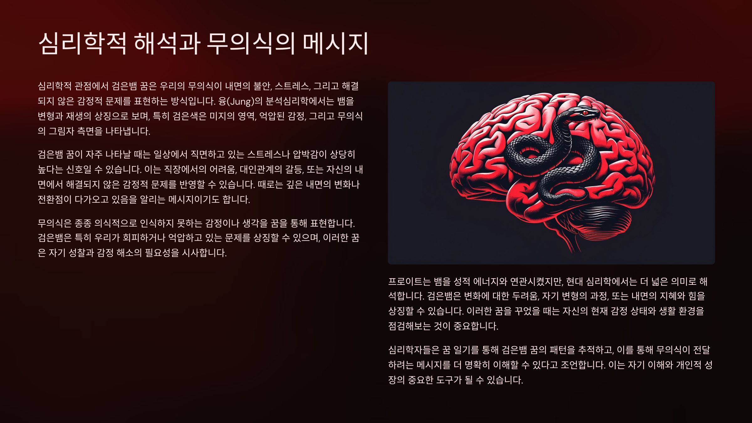 트라우마 관점에서 보면 검은뱀은 과거의 상처나 해결되지 않은 감정적 문제를 나타낼 수 있어요. 특히 어린 시절의 두려움이나 억압된 기억이 검은뱀의 형태로 나타나기도 해요. 이런 경우 꿈은 치유의 과정이 시작되었음을 알리는 긍정적인 신호로 볼 수 있답니다.