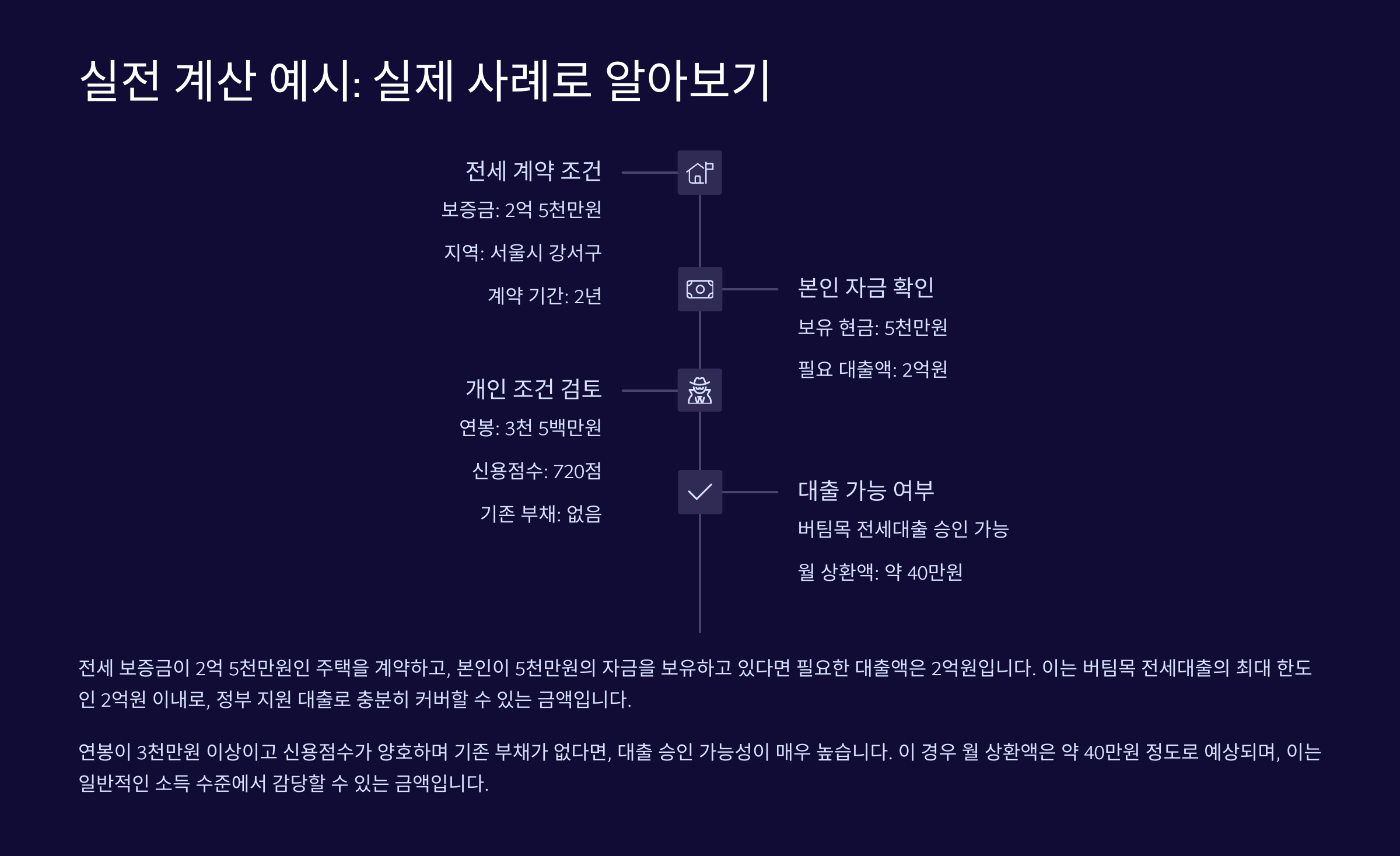연봉 5,000만원인 경우는 월소득 약 417만원으로, DSR 기준 월 상환액은 167만원이에요. 이 경우 대출 한도는 약 6-7억원 정도 가능하지만, 전세금 LTV 제한에 걸릴 수 있어요. 5억원 전세라면 최대 4.5억원까지 대출 가능하고, 버팀목 전세자금대출 소득 기준(부부합산 6천만원)에 아슬아슬하게 맞을 수 있어요. 하지만 배우자 소득이 있다면 초과할 가능성이 높아요.