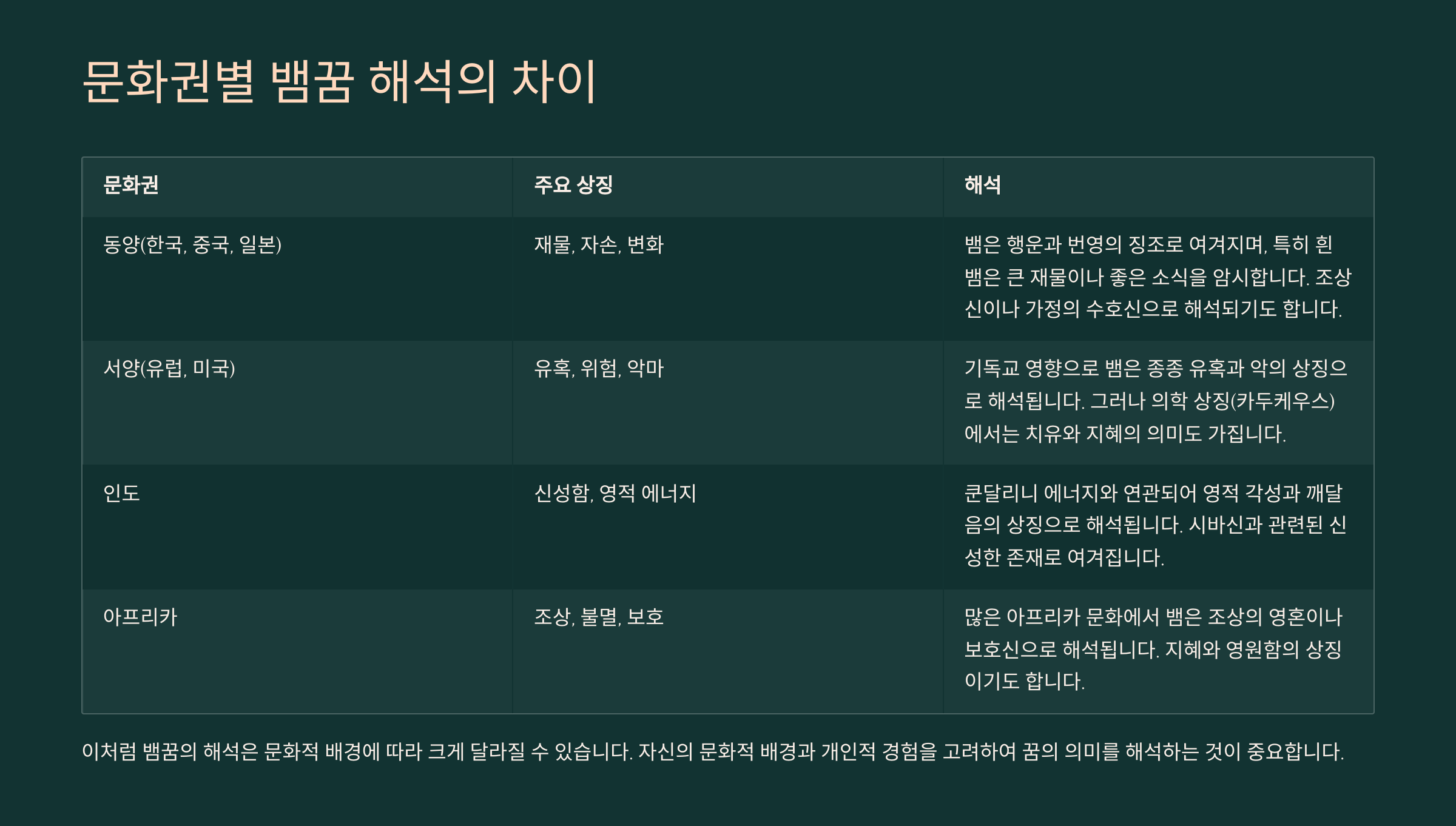 뱀꿈의 해석은 문화권마다 놀라울 정도로 다양해요. 같은 꿈이라도 동양과 서양, 그리고 각 지역의 전통에 따라 전혀 다른 의미로 받아들여지죠. 이런 문화적 차이를 이해하면 꿈 해석을 더욱 풍부하고 입체적으로 할 수 있답니다.