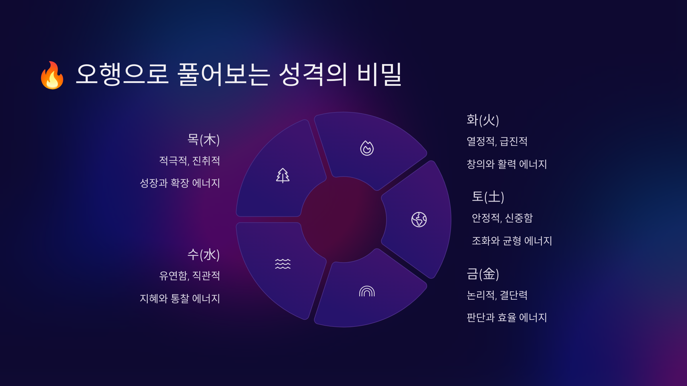 오행(五行)은 목(木), 화(火), 토(土), 금(金), 수(水)의 다섯 가지 기운을 말해요. 사주에서 이 오행의 분포와 균형이 우리 성격의 기본 틀을 만든답니다. 각 오행은 고유한 성질을 가지고 있어서, 어떤 오행이 강한지에 따라 성격의 특징이 뚜렷하게 나타나요.