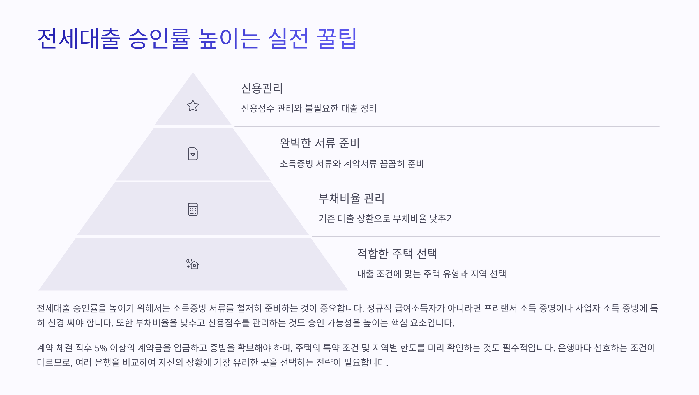 전세대출 승인률을 높이는 핵심 노하우를 알려드릴게요! 가장 중요한 건 바로 타이밍이에요. 월말이나 분기말에는 은행에서 대출 실적을 맞추려고 해서 평소보다 승인 기준이 완화될 수 있어요. 반대로 연초나 정부 정책 변화 직후에는 심사가 까다로워질 수 있으니 이런 타이밍을 피하는 게 좋아요. 또한 본인의 신용점수를 미리 확인해보고, 낮다면 신용관리를 통해 올린 후 신청하는 것이 유리해요. 신용점수는 단기간에 급격히 올리기 어렵지만, 작은 노력들이 누적되면 분명 효과가 있어요.