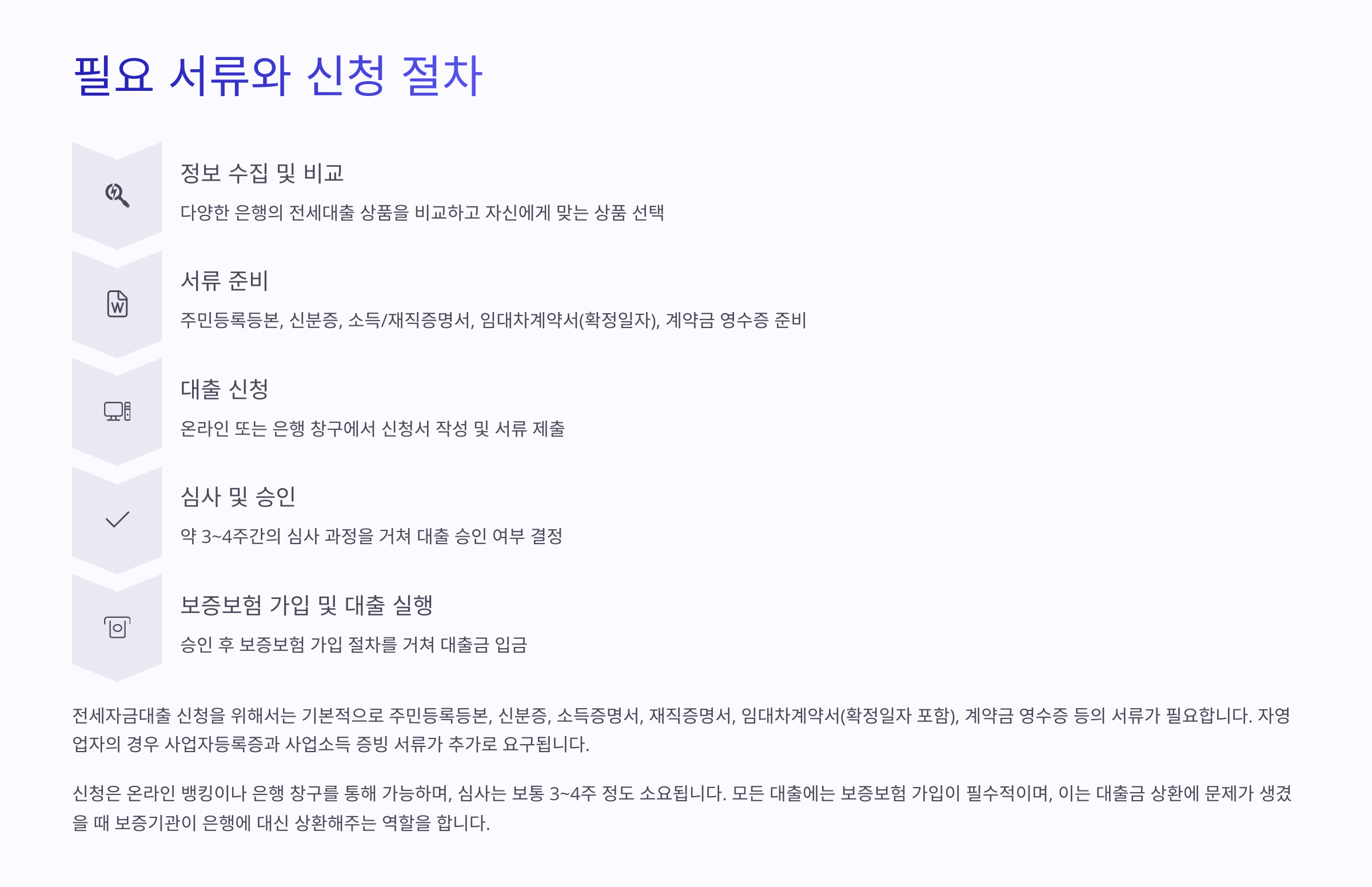 신청 절차는 은행마다 조금씩 다르지만 일반적인 프로세스는 비슷해요. 먼저 온라인이나 전화로 사전 상담을 받고, 대출 가능 여부와 예상 한도를 확인해요. 그 다음 필요 서류를 준비해서 신청하면, 은행에서 신용평가와 소득 심사를 진행해요. 동시에 주택에 대한 담보 평가도 이루어지는데, 이때 감정평가사가 현장을 방문할 수도 있어요. 모든 심사가 완료되면 대출 승인이 나고, 전세권 설정등기 후 대출금이 실행돼요.