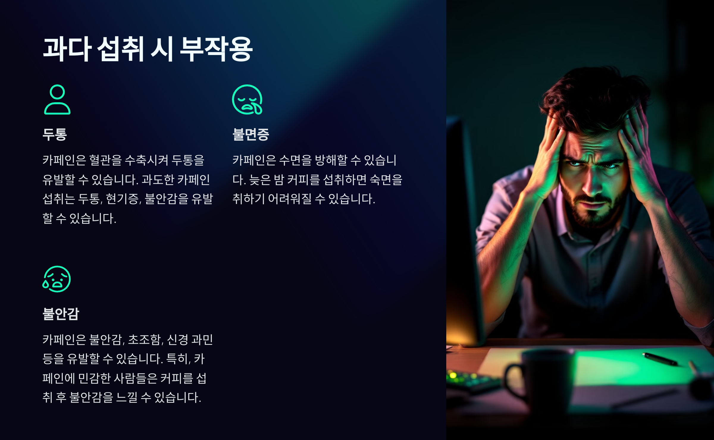 커피는 적당히 마시면 좋은 점이 많지만, 과도하게 섭취할 경우 부작용을 일으킬 수 있어요. 특히 하루 카페인 섭취량이 400mg을 초과하면 불면증이나 신경 과민 같은 증상이 나타날 수 있어요. 😴