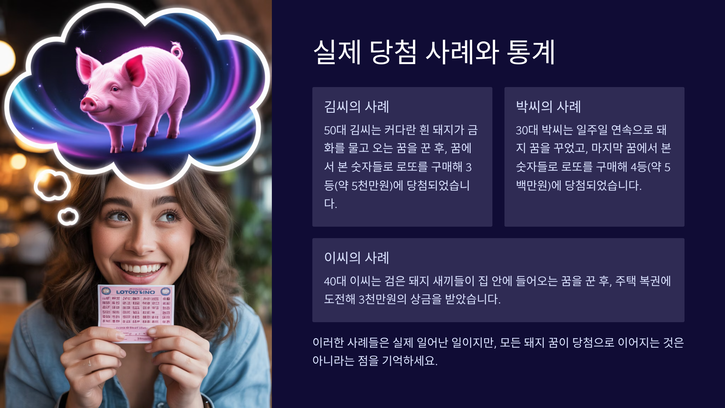 돼지 꿈을 꾸고 실제로 로또에 당첨된 사례들이 궁금하시죠? 언론에 보도된 사례들과 복권 판매점에서 수집한 이야기들을 정리해봤어요. 물론 과학적으로 증명된 것은 아니지만, 흥미로운 패턴들을 발견할 수 있었어요!