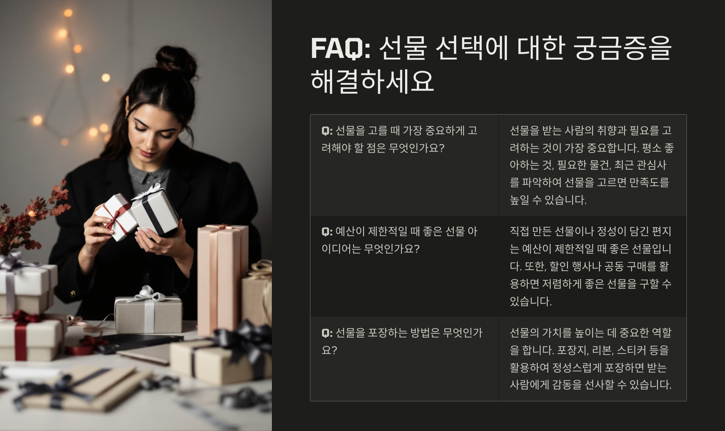 A2. DIY 선물이나 맞춤 메시지가 담긴 사진 앨범처럼 정성과 의미가 담긴 선물이 좋아요. 📷
