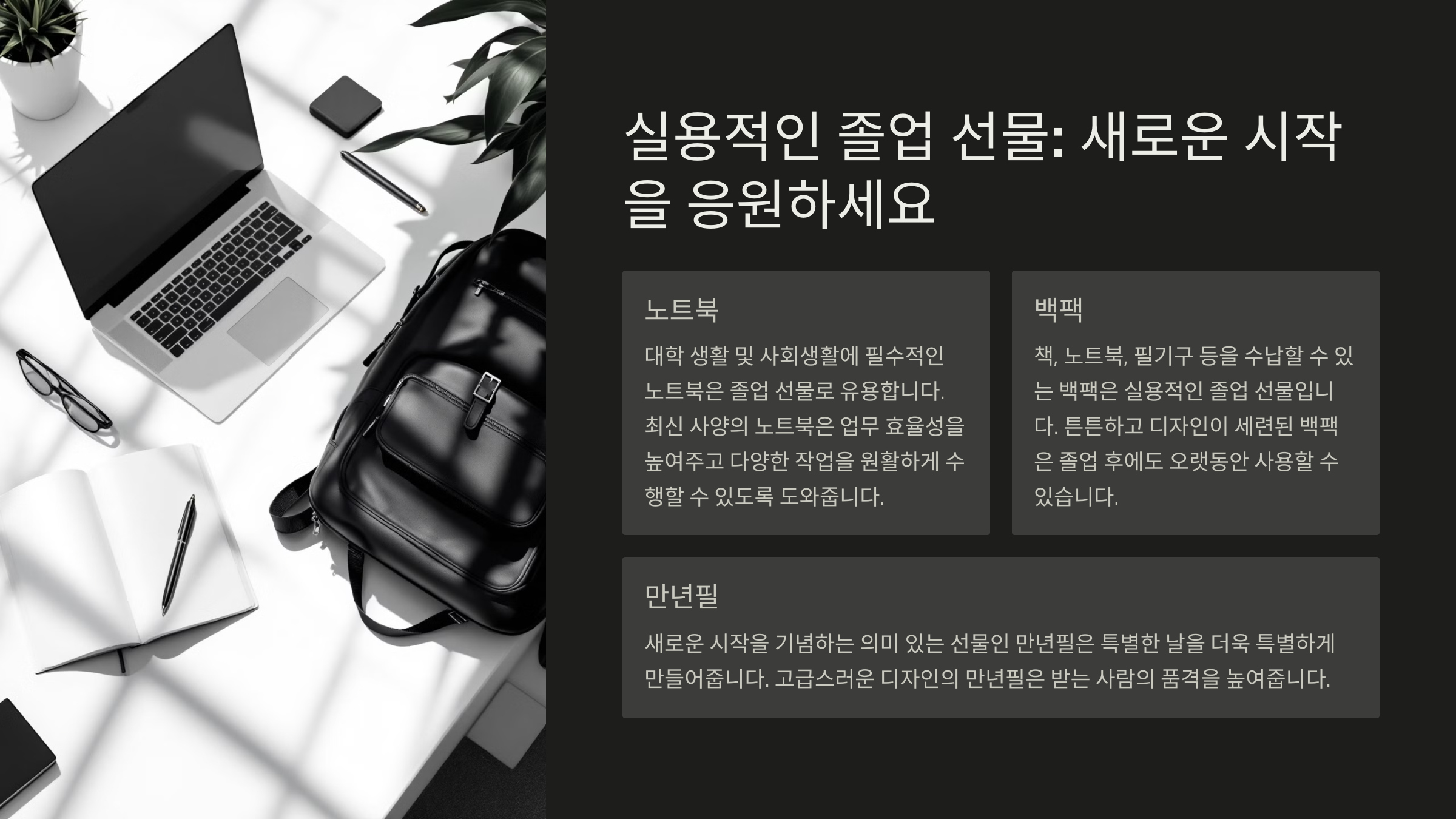 이처럼 실용적인 선물은 졸업 이후의 실질적인 필요를 채워주며 졸업생에게 큰 만족감을 줄 수 있어요.